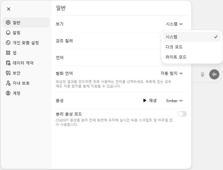 사용자는 ChatGPT 설정에서 테마(밝게/어둡게)를 바꿀 수 있는 경우가 많다.
