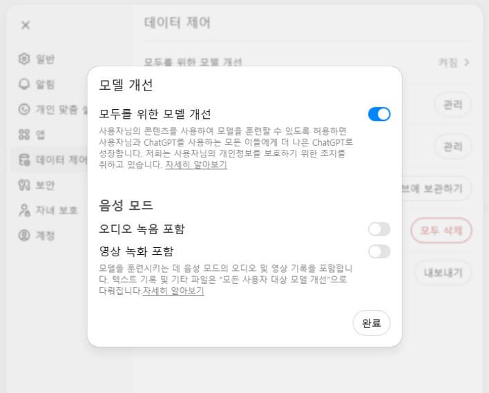 ※ 사용자가 '데이터 제어' 메뉴에 있는 모두를 위한 모델 개선을 'on'시키면, (기본 셋팅이 on으로 설정되어 있음)