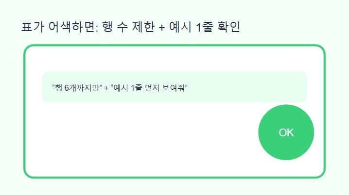 12. “표를 만들기 전에 예시 1줄을 먼저 보여주고, 제가 ‘맞아요/아니에요’로 확인한 뒤에 완성해 주세요.”